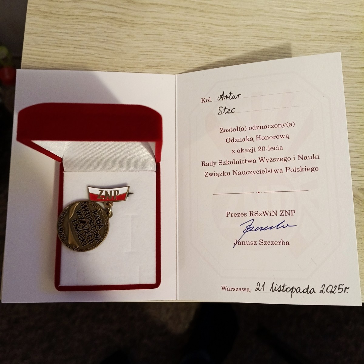 Podczas uroczystej Gali Jubileuszowej z okazji 20-lecia Rady Szkolnictwa Wyższego i Nauki Związku Nauczycielstwa Polskiego (ZNP) w Teatrze Ateneum w Warszawie Prezes ZNP w Politechnice Rzeszowskiej kol. Artur Stec oraz kol. Grzegorz Błąd, członek Zarządu Uczelnianego zostali wyróżnieni „Złotą Odznaką ZNP”. Ponadto Prezes ZNP w PRz otrzymał „Odznaką Honorową z okazji 20-lecia Rady Szkolnictwa Wyższego i Nauki”. Kol. Artur Stec jest na Wydziale Zarządzania adiunktem w Zakładzie Ekonomii, natomiast kol. Grzegorz Błąd adiunktem w Zakładzie Systemów Elektronicznych i Telekomunikacyjnych na Wydziale Elektrotechniki i Informatyki. Złota Odznaka ZNP jest najwyższym wyróżnieniem Związku Nauczycielstwa Polskiego. Odznaka jest nadawana przez Zarząd Główny ZNP za szczególne osiągnięcia w działalności związkowej, społecznej, oświatowej i naukowej. Podczas Gali byli obecni przedstawicieli świata nauki, szkolnictwa wyższego oraz partnerów społecznych, którzy od lat współtworzą przestrzeń dialogu i rozwoju polskiej edukacji akademickiej. Jubileusz był okazją do podsumowania dwóch dekad pracy na rzecz środowiska akademickiego, dialogu społecznego i obrony praw pracowników nauki i szkolnictwa wyższego.